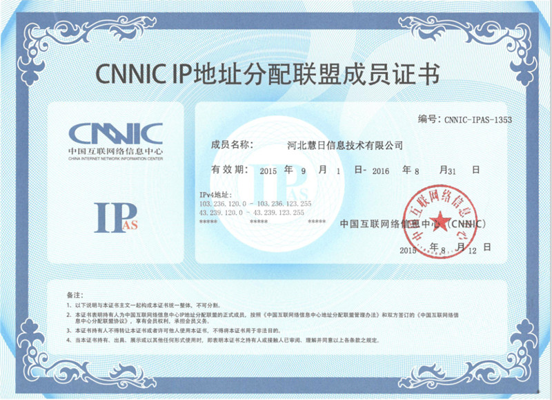 2015年8月12日河北慧日信息技术有限公司成为CNNIC(中国互联网信息中心) IP地址分配联盟成员并获得CNNIC颁发的成员证书。